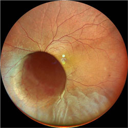 討論該患者的廣角成像提供了從眼睛中央測量的163度視網膜影像,使我們能在一幅圖像中同時看到后極部和周邊的視網膜。在本病例中,我們可以在同一張圖像上清楚的辨認出腫瘤受累區域和下方周邊部滲出性視網膜脫離的范圍,而傳統的30~45度眼底彩照是不可能實現的。此外,超廣角影像對于隨訪比較治療后腫瘤的大小以及滲出性視網膜脫離的范圍的變化也非常有用。