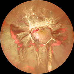 玻璃體出血減少,但在Mirante超廣角圖像上明顯可見累及黃斑的牽拉性視網膜脫離。