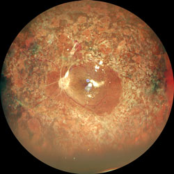 治療在PDR合并玻璃體出血和TRD的診斷下,患者接受玻璃體切除手術,剝除纖維血管增生膜,并行全視網膜光凝,硅油填充。1個月后,視網膜貼附良好(圖2),左眼BCVA提高到20/100。