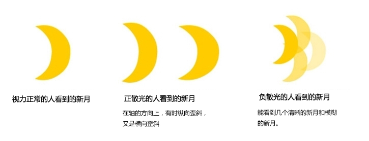 另外,散光程度不同,看到的東西也不一樣。正散光的人在視物時,視線會歪斜到散光較強的方向。這些歪斜包括縱向歪斜、豎向歪斜以及斜面歪斜。負散光的人,總是把一個事物看成多個事物。例如在晚上看月亮或者交通信號燈時,可能會看到多個。