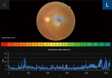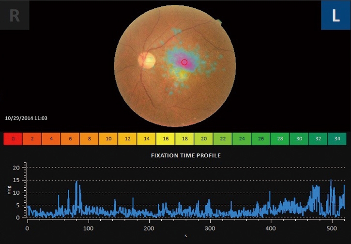MP-3通過患者簡單地注視目標(biāo)物來測定固視情況,并記錄軌跡在微視野測量過程中不斷的追蹤患者的眼球,術(shù)前和術(shù)后任何細(xì)微的固視變化都可以檢測并體現(xiàn)出來。這項(xiàng)檢測可以評估中心視野缺陷患者的固視情況,并確定治療后固視是否改善。