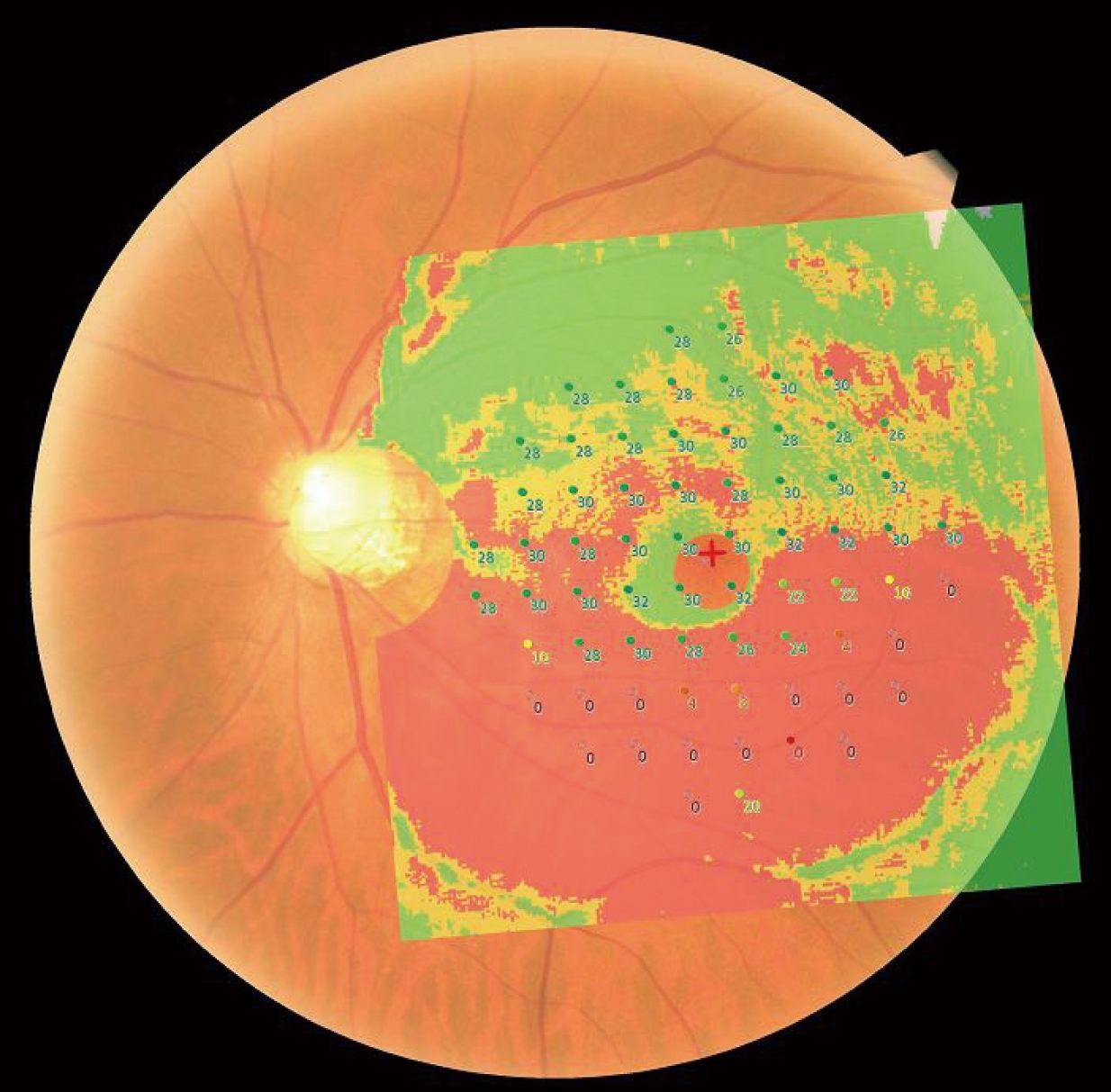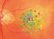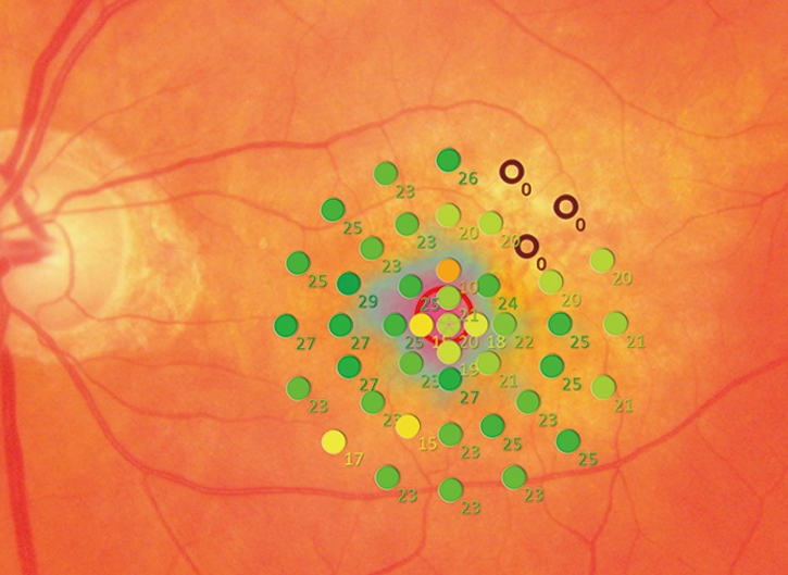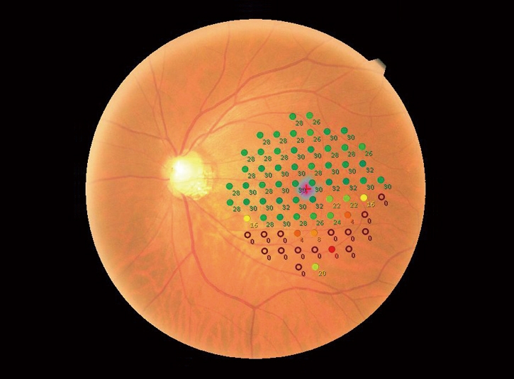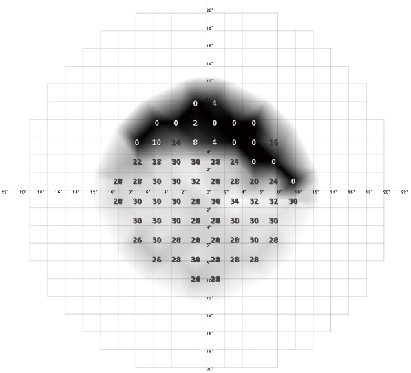 視敏度圖可以灰階顯示視敏度變化,類似于傳統(tǒng)的視野報(bào)告。該顯示可以更直觀的評估視網(wǎng)膜靈敏度。