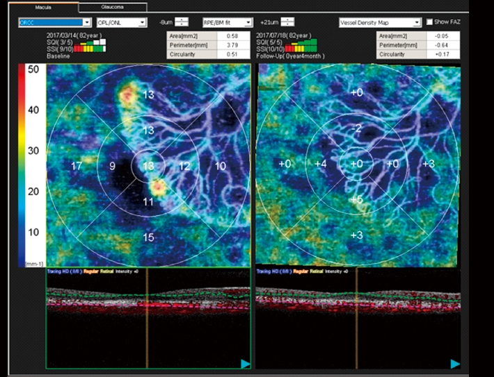 量化每層血管后,可提供評估疾病進展和治療效果的指標。可使用血流密度圖和灌注密度圖進行量化分析。