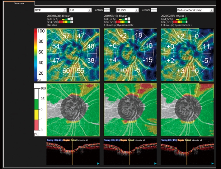 界面簡潔,黃斑地形圖分七層分析,視盤地形圖分四層分析,功能直觀,可去除投射的偽影。分成多個板塊可以增強對特定深度和感興趣區域的視網膜微血管系統的評估。