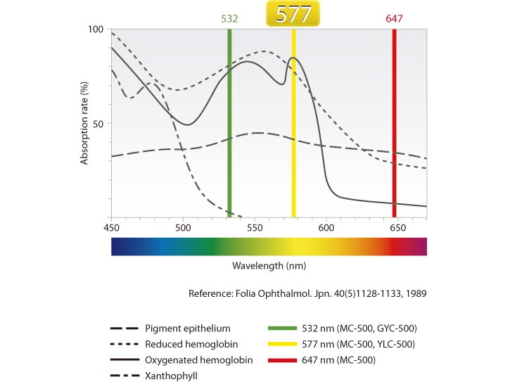 與532 nm激光相比,577 nm黃色激光幾乎不被葉黃素吸收,但能夠很好地被氧合血紅蛋白所吸收,這使其成為治療黃斑部附近病變的首選波長(zhǎng)。